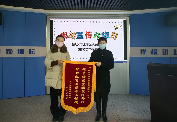 在本次宪法开放日活动,育才汉口小学与江岸区人民检察院未成年检察部门共建法治基地。育才汉口小学向蒲公英工作室送来了锦旗,未检检察官梁东受聘为育才汉口小学的校外辅导员。今后蒲公英工作室将会积极履行普法职责,护航同学们的成长。